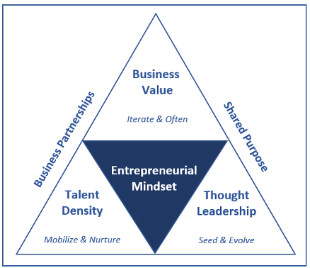 As illustrated by the photo below, this operating philosophy embraces the idea that the ultimate measure of success is demonstrated business value delivered incrementally and often. To achieve this success, there are two cornerstones: talent density and thought leadership.