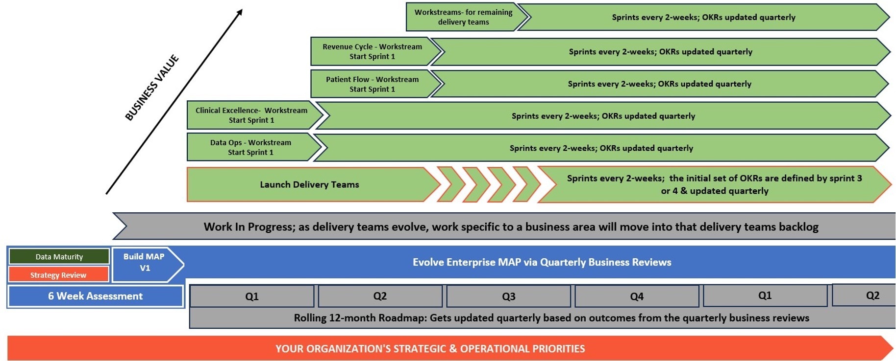 Avoid Analysis Paralysis. In the realm of data innovation, analysis is critical. But too much is paralyzing. The beauty of the MAP is its iterative nature. Start with just enough to get going. Adjust course (when needed) along the way. Set the 12-month goal and monitor progress quarterly using OKRs. Allow the delivery teams to do their thing. Working in 2-week sprints minimizes analysis paralysis and often removes it. Trust the process and let it unfold for the first 3-6 months. Our experience has shown that this approach works and delivers business value (cost reduction, improvement in care, increased access, etc.) very quickly.
