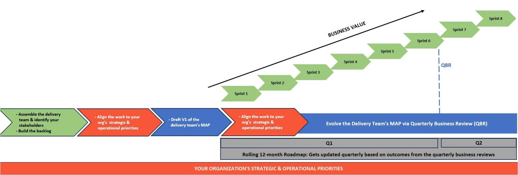 Step 7. As the different delivery teams are stood up, each will define their OKRs for the quarter to frame their sprints. And each will perform a quarterly assessment of their OKRs and how they support the evolution of the MAP as a standard governance practice. Keep in mind, the first six months can be bumpy but stick with it, things will improve.
