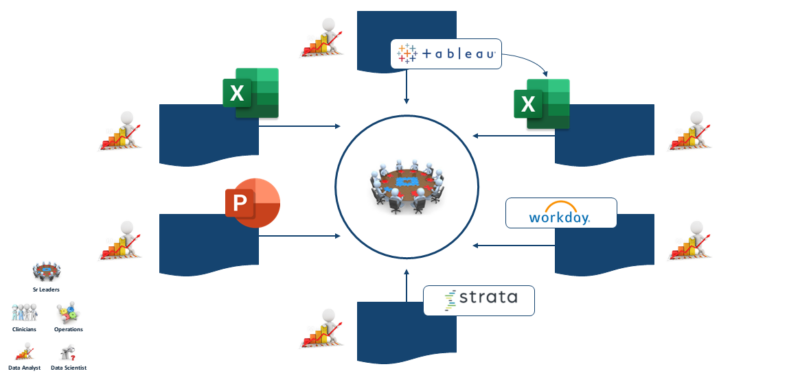 To get started, it is helpful to understand the problem. In most organizations, data consumption looks a lot like the illustration below. As you can see, each senior leader has to distill data from multiple sources to understand the health of their business. This could take 30 minutes or more daily. Even at that, there are holes in their understanding and that understanding doesn’t reconcile with peers or team members — requiring more time to reconcile the different versions of health.