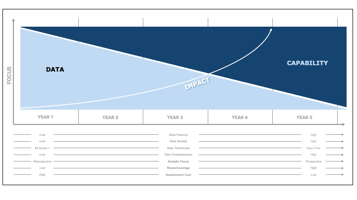 Throughout this series, we have discussed many aspects of becoming a data-driven community – operating model, innovative mindset, analytics and AI tools, data platform, etc. With each step on our journey, we evolve our data and capabilities, demonstrate value, learn to navigate organizational change and grow our data fluency. Like a flywheel, once momentum begins to build, each successive step requires less effort while demonstrating greater impact, as illustrated in the figure below: