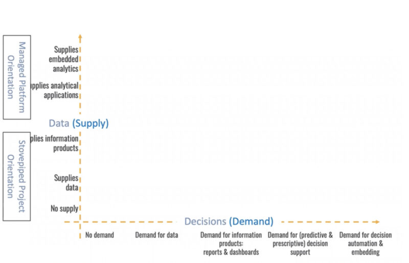 On the supply side, we tend to see a split between the lower and upper halves. Initially, there's a pattern of isolated, project-based work—what we call a “stovepipe” approach, where activities are repeated in silos without integration. Eventually, analytics teams transition to a more product-driven, reusable methodology. This shift involves a managed platform orientation that breaks away from the repetitive stovepipe method, fostering repeatability and efficiency.