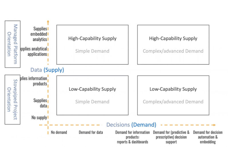 So, let’s dive deeper into the balancing act of analytics maturity. On the supply side, in terms of levels of maturity from the bottom of the vertical axis up through the top, is a range from a complete absence of data analytics, progressing to basic data, then to information products and analytical applications, and currently, the state of the art involves supplying embedded and automated analytics. On the demand side, moving from left to right on the horizontal axis, we go from no interest in using data for decision-making to a rudimentary demand for data, where the thought is, “I'll just take the data and make my own decisions.” This evolves to a demand for more sophisticated information products—reports and dashboards—and further to seeking predictive and prescriptive support, and finally, decision automation and embedding.