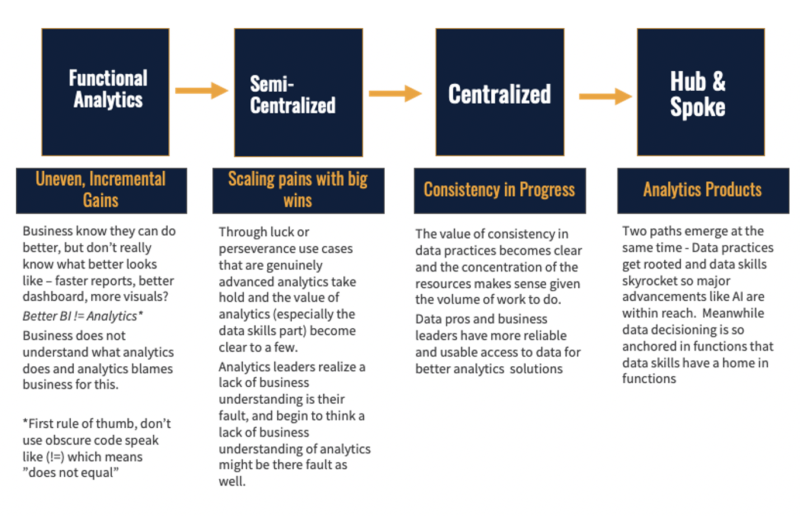 You will need to move towards a Hub and Spoke model or at least reduce the centralization of analytics and increase analytics in the business lines if you ever hope to “become data driven” or “democratize data.” By definition these ambitions mean that a factorially larger number of people work actively and deeply with data. And to do so you need to find a programmatic way to move the activities out of the Centralized analytics function – that’s for certain. And while these are two approaches, how you do it? Well, that depends.