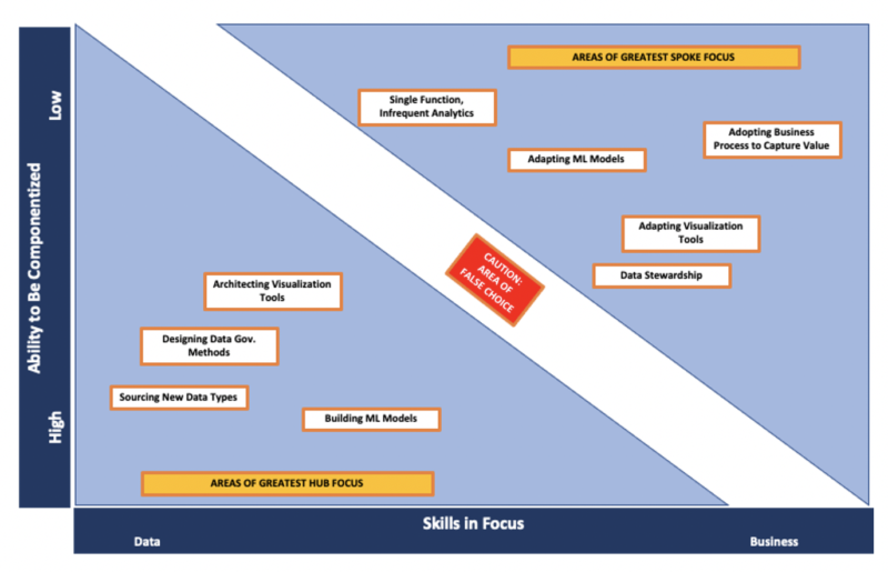 Another approach is to map your analytics value chain activities across two axis – the degree of data vs business skills that are required and the degree of uniqueness vs universality, keeping in mind that a core part of the Hub’s role is to make reusable data and analytics components that enable effective Spokes. With this model it’s critical to push against the tendency that has been developed inside a large Centralized analytics organization to control data and analytics through programs, projects and committees and instead push activities toward the business or the data side, towards the unique or the universal. Avoid the upper left and lower right corner, and especially the middle ground of mediocrity.