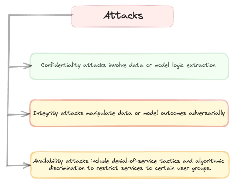 Attacks: Many parts of machine learning systems, like software and prediction tools, are vulnerable to cyber and insider attacks. Once an attack happens, we lose control, and the attackers may have their own goals related to accuracy, bias, privacy, reliability, and more. Researchers have extensively documented such attack categories, namely confidentiality, integrity, and availability attacks.