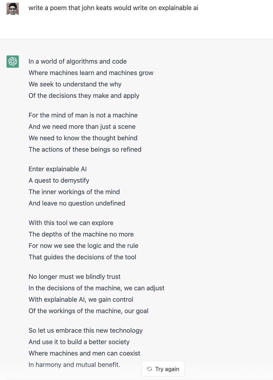 In a lighter vein, our CEO, Krishna Gade, used ChatGPT to create a poem on explainable AI in the style of John Keats, and, frankly, I think it turned out pretty well.