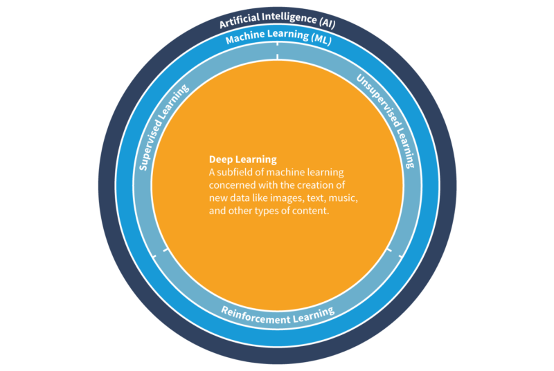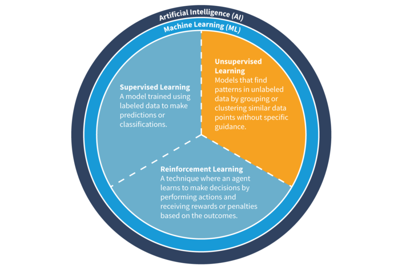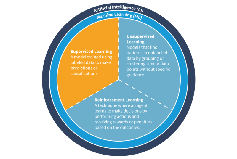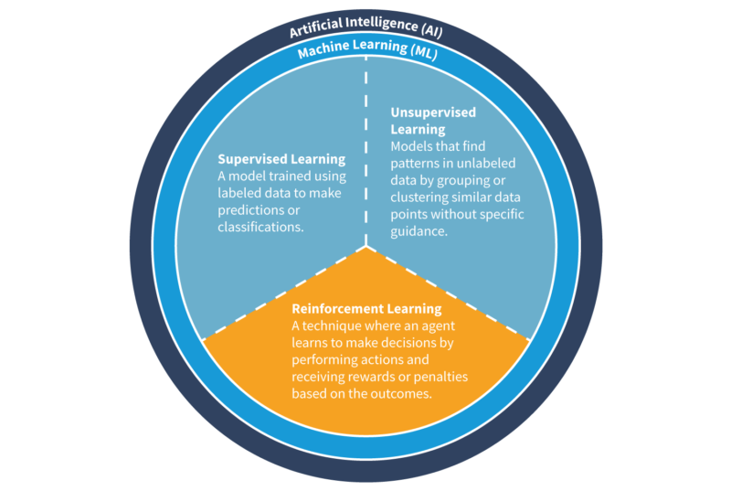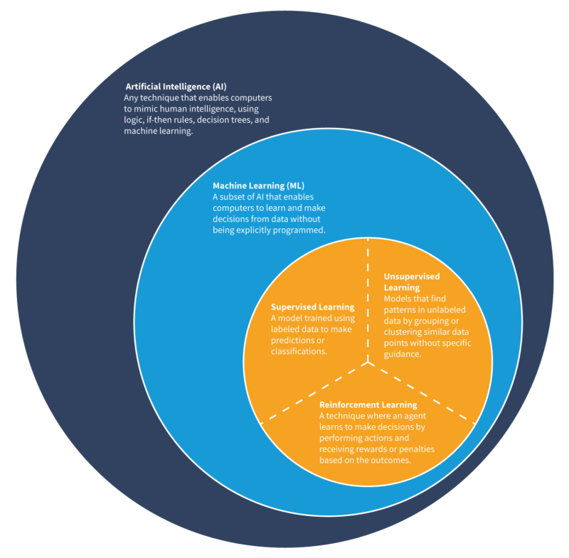 The majority of what we will discuss in this resource fits under the broad heading of artificial intelligence, commonly defined as “any technique that enables computers to mimic human intelligence.” Machine learning underpins the majority of AI. Within machine learning, the major divisions are supervised learning, unsupervised learning, and reinforcement learning. Understanding how these concepts relate puts you on solid footing for most of the field.