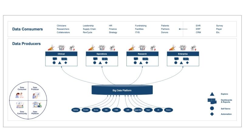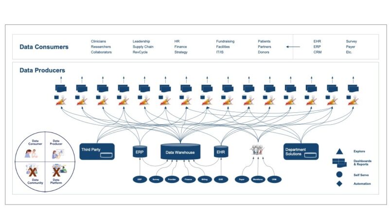 In this example, the data consumers and producers work in partnership on small, agile, multidisciplinary teams that are aligned and embedded in a project or functional area (business, clinical or research). Data Consumers have the skills and tools to access, analyze, and act on data effectively. They understand data quality parameters, and can confidently use data to drive decisions, take action, and evaluate results. Data producers serve as enablers and partners rather than bottlenecks, focusing on creating scalable, reliable data products that serve multiple use cases across the organization.