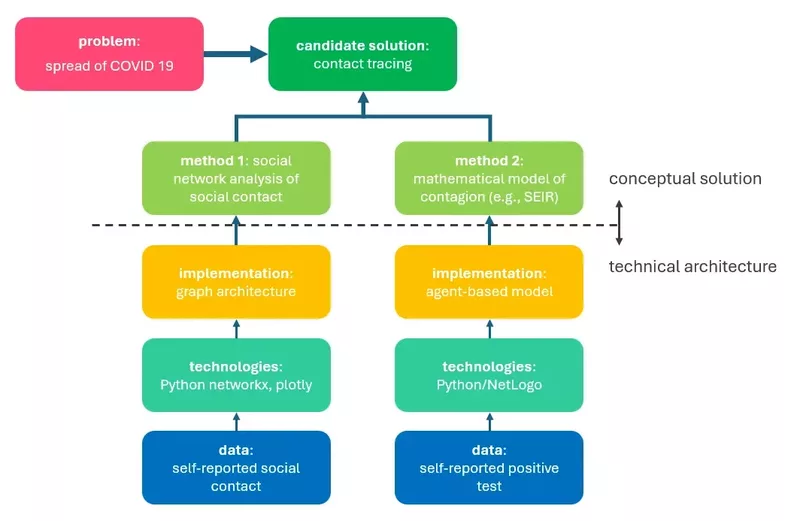 For example, if the problem we are trying to solve is the spread of COVID-19, we may pursue the distillation of a contact tracing solution as outlined in the image below. The candidate solution of contact tracing could involve two methods: 1) social network analysis of contact, and 2) mathematical modeling of contagion (e.g., SEIR model). The technical implementation of these methods will involve selected technologies or software products, and the relevant datasets. The work of designing the conceptual solution is that of methodologists and data scientists. The work of designing the technical architecture is that of solution architects and engineers.