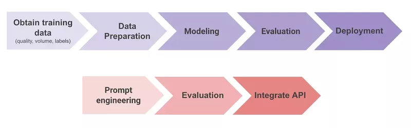 By contrast, with GenAI, the workflow simplifies dramatically: select the appropriate LLM, engage in prompt engineering or prompt iteration, perform offline evaluation, and use an API to integrate the model into production. This greatly reduces the time from idea to deployment, often taking just weeks instead of months. Moreover, much of the maintenance burden is managed by the LLM provider, further decreasing operational costs and complexity.