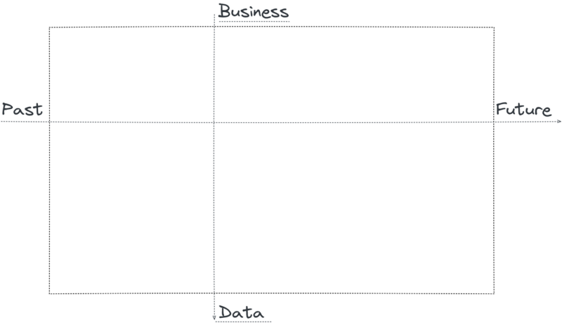 To plot most data fields, we’ll use a coordinate schema. This schema will use two primary axes: one for time and one for business-data context. The time axis represents if we’re working with the data already collected, real-time, nearest future, etc. The business-data context axis represents the business/data ratio required for a field.