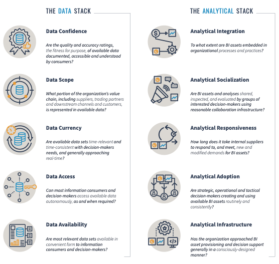 4. Organizations quickly achieve BI sufficiency when data-driven decision-making is embedded in corporate values, formulations, and procedures. Full-throated adoption by senior leadership, coupled with top-down demand, propels the organization to recognize advanced analytics as essential, with leaders modeling expected behaviors and funding projects for platform development.