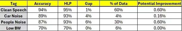 Accuracy is how well the model performs, HLP is how well humans perform, the gap column shows the distance between model and human performances, percentage of data shows the overall presence of that tag within the dataset, and the far-right column, potential improvement, shows how much potential the model has to improve accuracy in that specific tag.