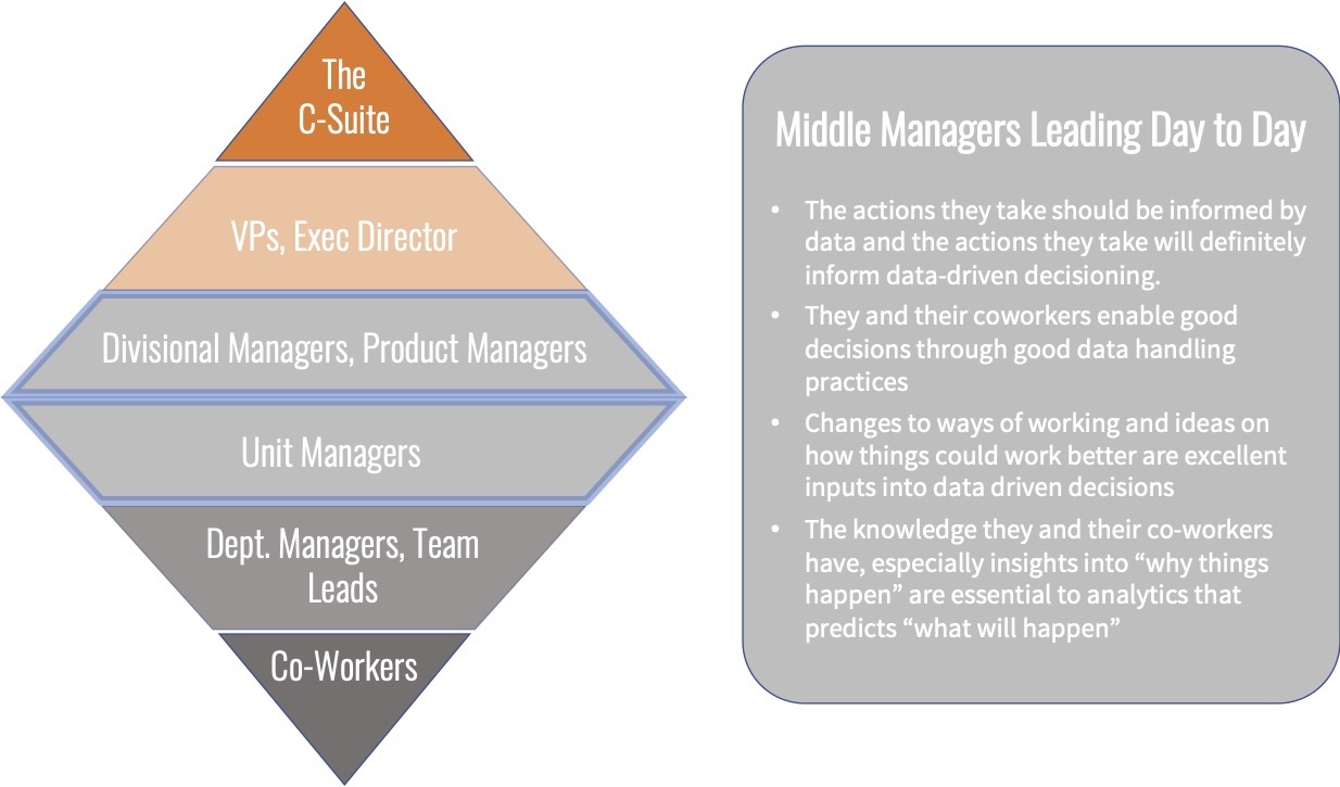 - The depth of training increases as you get to the middle of the organization. Given the extreme bias toward action these folks have, as well as the delivery focus of their teams, classroom training is not likely. Instead there should be live chances to provide feedback on the data-driven decisions, often embedded in systems like labor scheduling systems. Deploying new processes that are born of data insights and leverage data insights offers a great time to anchor some data knowledge. Finally, if these roles lead any manual data entry (yes, that still exists), then helping these folks see how valuable their work is in the data-driven context is essential.