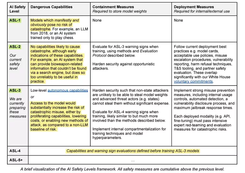 When evaluating risk in ML system deployment, a common approach involves calculating materiality considering the likelihood of harm and anticipated loss. High-materiality applications demand greater attention. Effective governance appropriately allocates resources to high, medium, and low-risk systems. For example, the recently released Anthropic A.I.'s Responsible Scaling policy introduces the concept of AI safety levels (ASL), loosely inspired by the U.S. government's biosafety level (BSL) standards for managing hazardous biological materials. Here is a snapshot of the same: