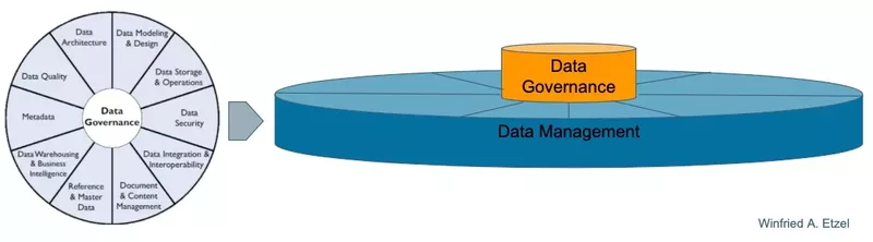 In Data Management Association (DAMA) language, data governance is placed at the center of the data management wheel, a notion that still stands, yet in a three-dimensional model, it will be at the center, but elevated.