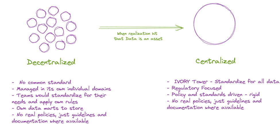 The first state on the evolutionary ladder can be politely termed “decentralized.” It was actually the wild west, and everyone did as they pleased with zero re-use and no common standards. At this time, individual parts of the business were responsible for their own data — almost universally transactional in nature. Each business unit would store and manage its own data in its own way — a Banks Deposits business would hold information related to client deposits, the Investments business would hold information related to client investments, and so on. This approach led to multiple pools of transactional data scattered across the organization and aligned to functional business units.