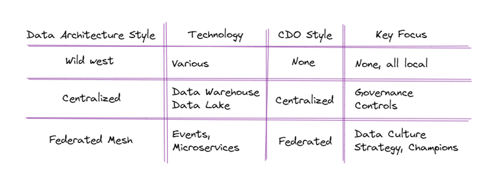 This new architectural style brings with it implications for any CDOs comfortably established to operate in the common centralized model. Perhaps the most fundamental aspect of the data mesh architecture is that the ownership and accountability of the data is federated out to the business domains that understand, create and manage the data itself — the experts. Attempting to follow the more traditional model of data governance espoused by many CDOs will only result in blurred lines, grey areas, gaps, and unnecessary friction between parties.