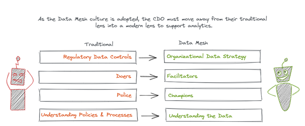The Data Mesh by Zhamak Dehghani challenges organizations to think differently about their data by treating it like a product to enable analytics and data science. The Data Mesh can be leveraged to radically rethink the CDO organization. There can be two ways a traditional CDO can approach the Data Mesh. The first will view a Mesh as very much a threat to the status quo — that it would disrupt the normal operations of the CDO and associated data management groups. The second viewpoint is that a Mesh is an exciting opportunity that has the potential to fundamentally change the data narrative in the organization, and therefore is something that should be explored with pace. Both viewpoints are correct. Done well, a Data Mesh will dramatically change the operations of a CDO, but this shift should be a positive disruption — allowing the CDO to not just remain relevant but to actually become a more critical part of the business, true leaders in embedding a data culture into the organization.