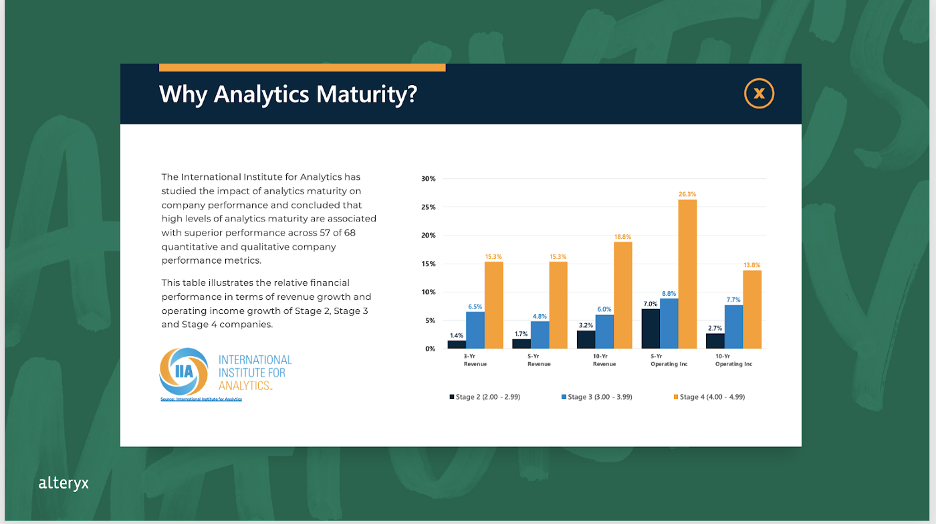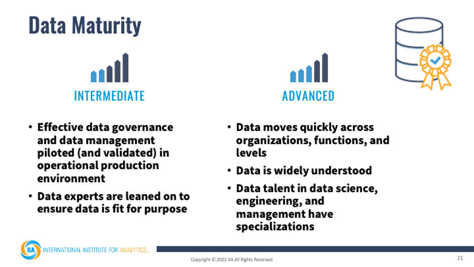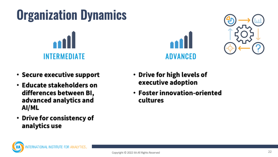 I’ve discussed key ways to become more analytically mature; however, the very first step in advancing your analytics maturity is understanding where you’re at. Here’s an interactive analytics maturity assessment that takes only five minutes to complete. It will score your company and assign one of five levels of maturity. The tool will then prescribe resources to help you progress in your analytics journey. For in-depth support and directed guidance, I’d recommend IIA’s services.