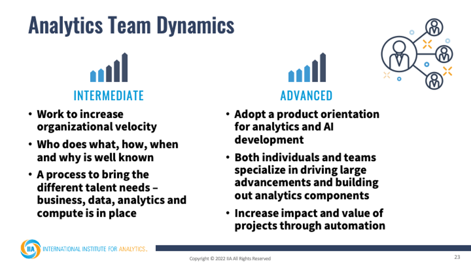 Team dynamics can be internal and external. This covers how well analytic teams work with each other (think analysts and data scientists) and how well they work with key stakeholders across the organization.