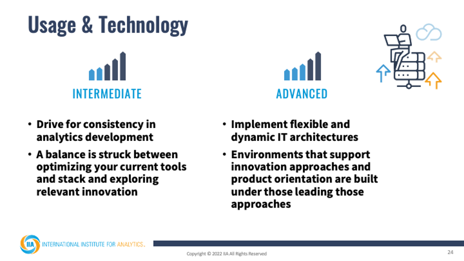 Having the right analytic solutions and IT infrastructure can make all the difference in your analytics maturity. To improve this dimension, begin making plans to scale and build your analytics infrastructure. You’ll also want to explore cloud-based analytics and consider how well any platform would integrate with your tech stack.