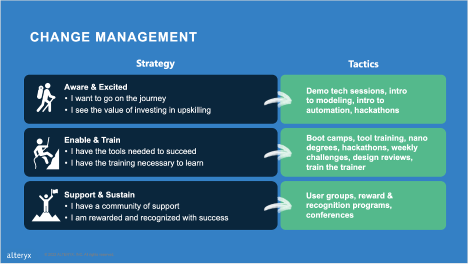 Essentially, data democratization is a change management process. There are three steps that lead to best-in-class democratization — and they are the basics of nearly any change management journey:
