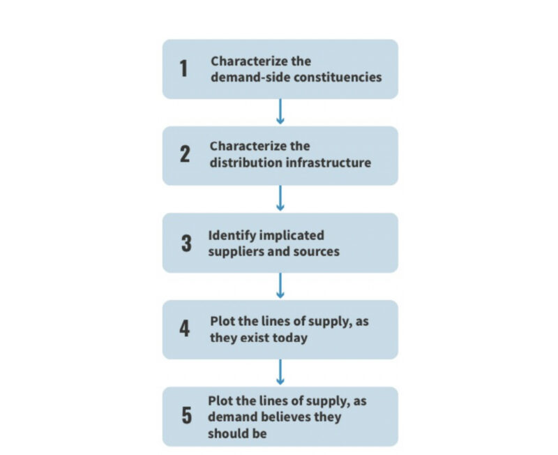 - Plot the lines of supply as they exist today. After characterizing the demand-side constituencies and the distribution architecture, and after identifying implicated suppliers and sources, the next step is to plot the existing lines of supply. This includes both the formal and informal lines of supply. Do back-of-the-envelope assessments of the volume and velocity of data moving through each line of supply, as well as the frequency of access and the service coverage. Also, look at the decision-making potential and commercial impact of the constituencies being served.