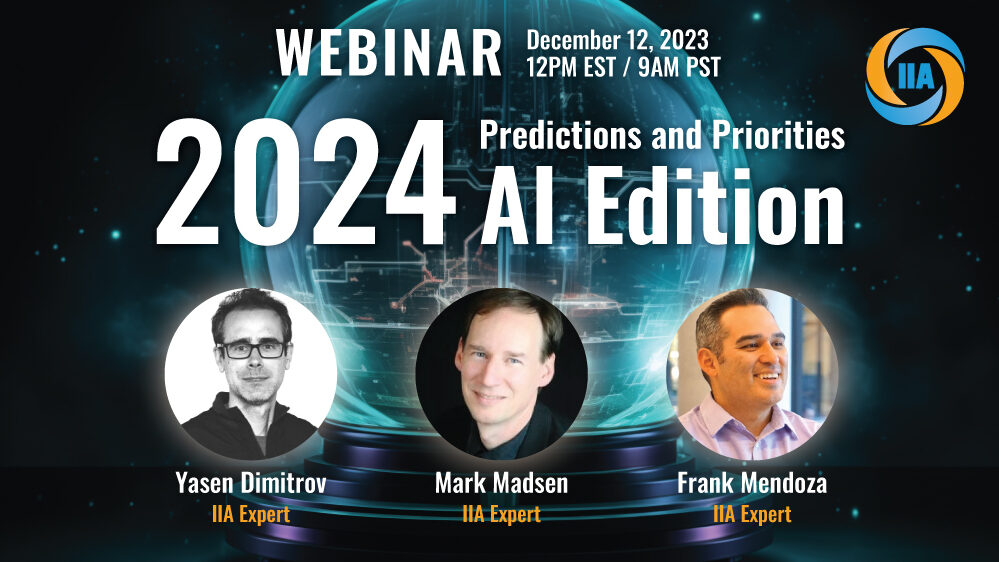 Join this powerhouse panel of IIA Experts where we explore emerging trends, technological shifts, and strategic considerations shaping AI strategy in 2024. This session will help you re-think old paradigms, cut through the AI noise, and plot pragmatic plans as you build your AI roadmap. Attendees who join this session live will be first to access IIA’s complimentary research brief: “2023 Predictions and Priorities: AI Edition.”