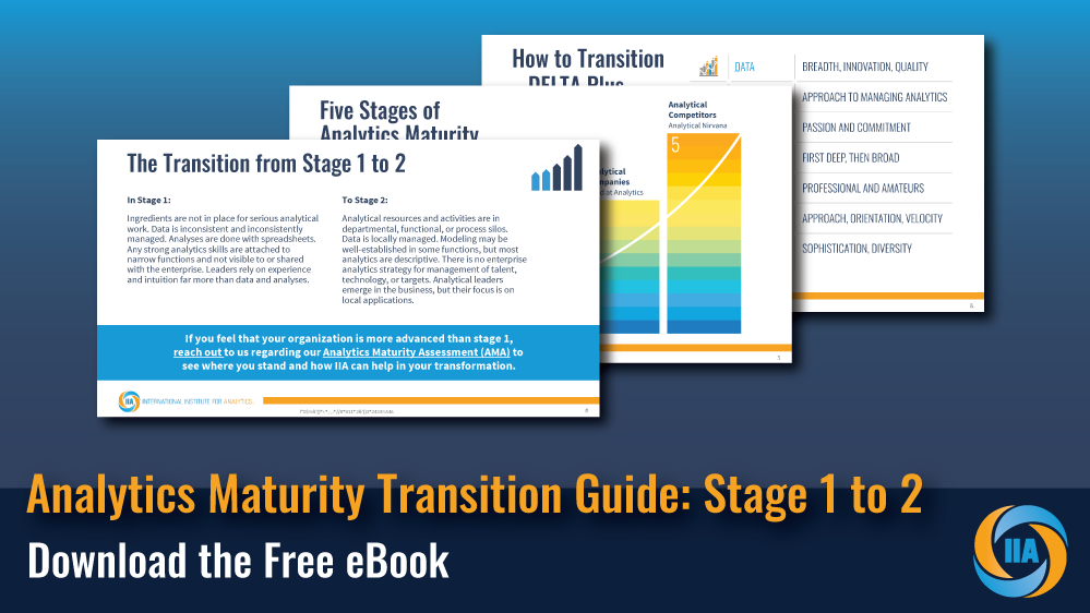 IIA RAN Clients already have access to the complete Analytics Maturity Transition Guide: Stage 1-2 Research Brief as well as the Transition Guides for Stages 2-3 and Stages 3-4 which all provide richer detail and guidance on how to advance all 7 DELTA Plus elements of your organization. Additionally, RAN clients have direct access to the experts that developed these frameworks.